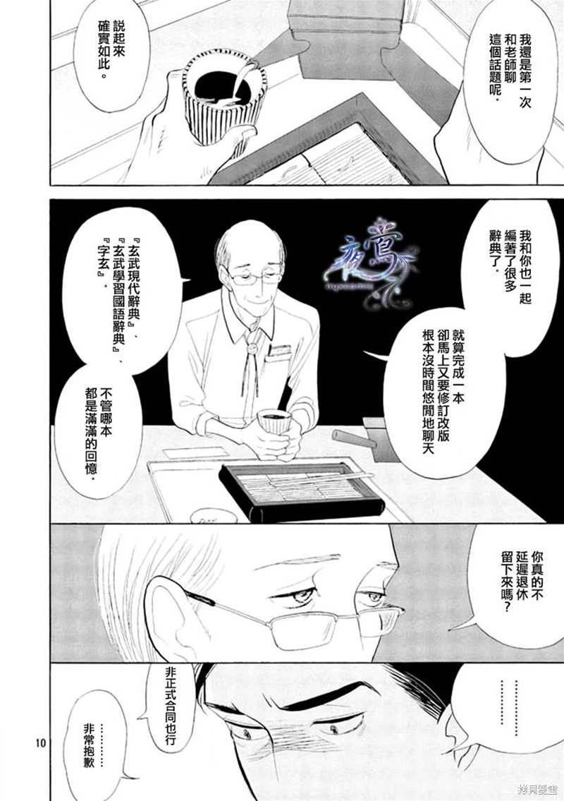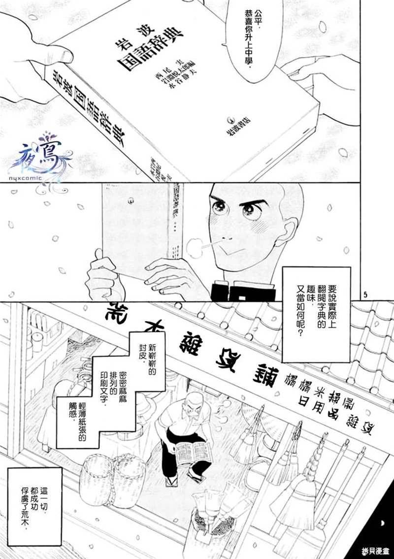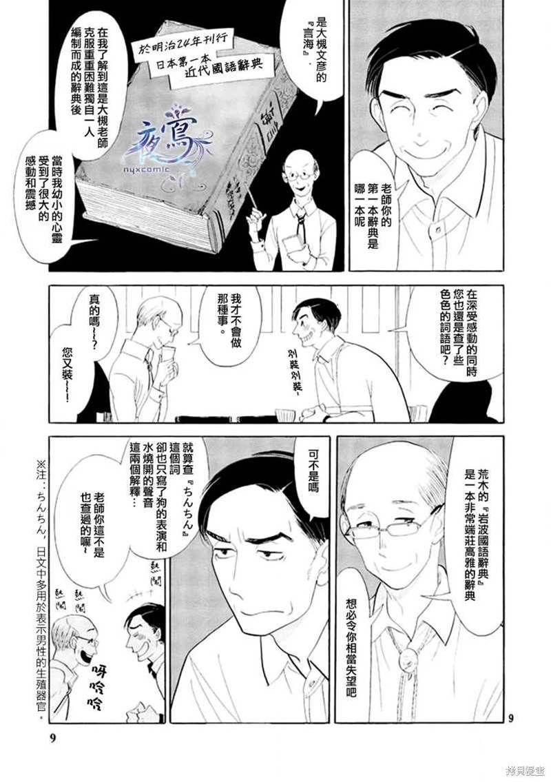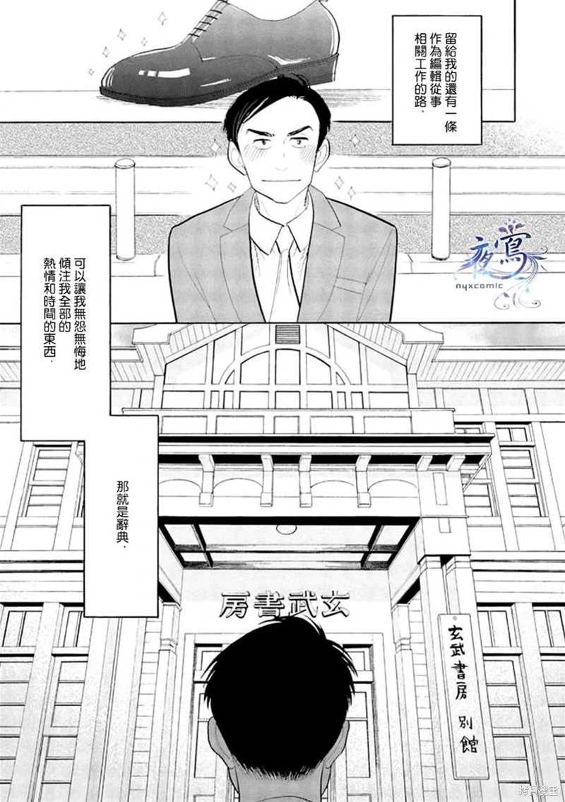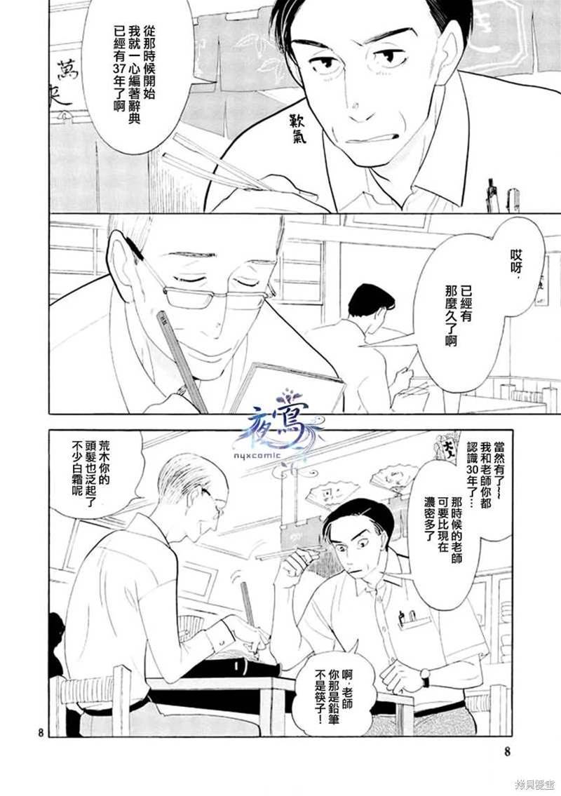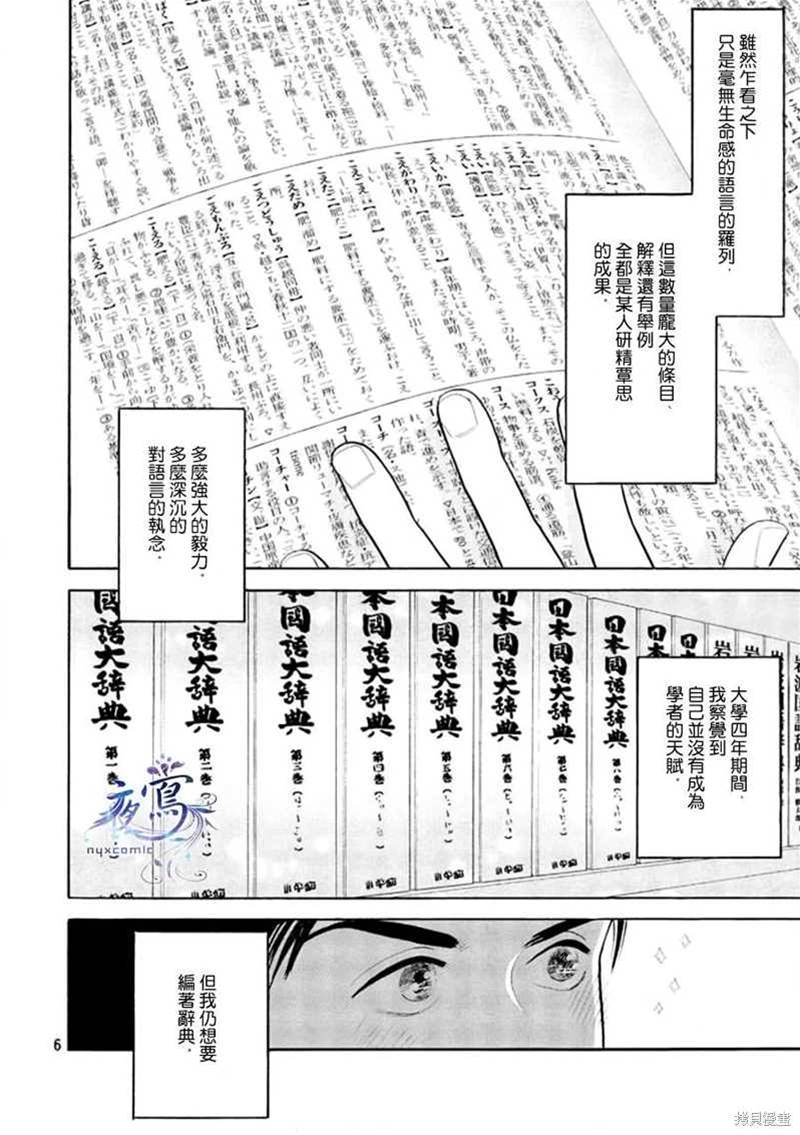 編舟記漫畫 ,出版社·玄武書房在進行著辭典「大渡海」的刊行計畫,辭典編輯部的老編輯荒木退休在即,想要找到合適的人接手他的工作,他從同事西岡那得知一個人選——營業部的馬締……辭典編輯部、出航——!